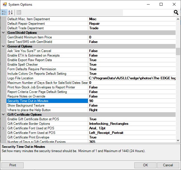 NOTE: If extending the timeout, be sure your staff is diligent with manually logging out once complete or it will cause internal issues tracking user permissions. For example, if management was logged in and a sales associate took over the PC, you would be giving associates higher security than they should have.