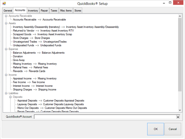 NOTE: Inventory, Repair, and Miscellaneous Income accounts will be set on their respective tabs.
