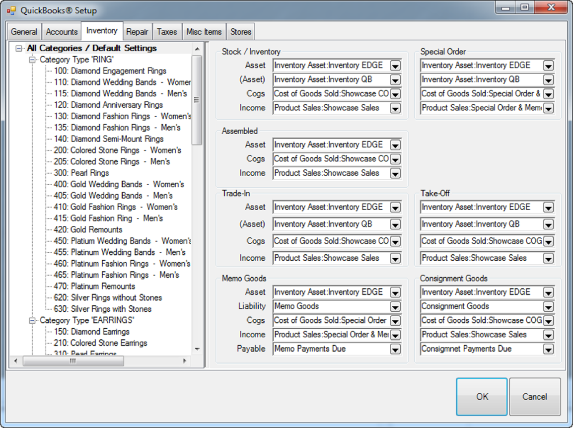 The panel on the right allows you to specify the QuickBooks accounts where The Edge will post based on the Inventory Stock Type.