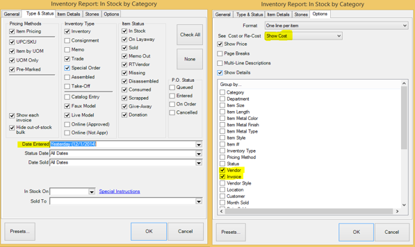 - To find out what vendors and invoice numbers you entered for the day, go to Reports > Inventory > In Stock by Category.
