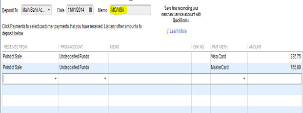 - Select the bank account, enter date of deposit, and in the memo line, select Cash/Checks, MC/VISA, AMEX, Discover, etc. You should deposit your money in QuickBooks in the same way that it will appear on your bank statement for an easy bank reconciliation process.