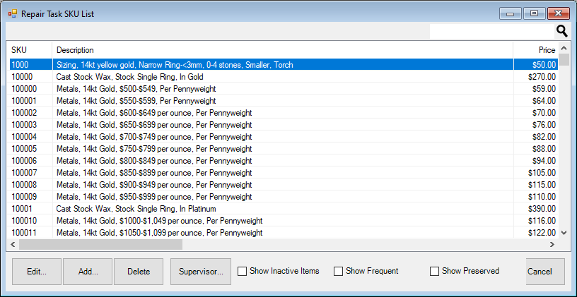 When entering new repairs, you are asked to assign a SKU to the task. These SKUs are defined in Repair SKUs. To define a new SKU or edit an existing record: