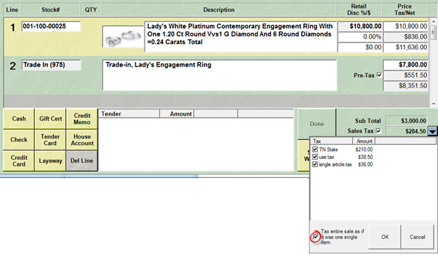 The amount of tax to be collected on a trade-in depends on whether the trade is being applied to a like-item purchase or not. For example, taking a ring trade-in against the purchase of a new ring as opposed to taking a trade-in of a watch against the purchase of a diamond necklace.