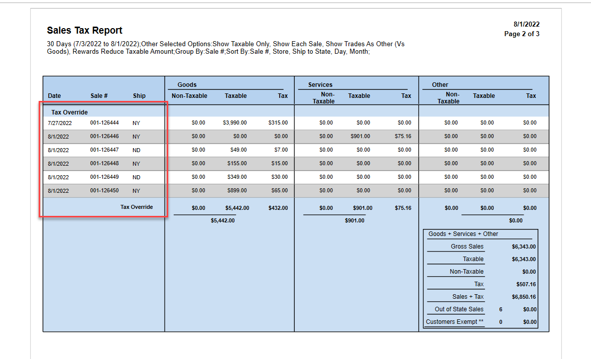 There are two reports you can run for reporting on sales tax manually updated with the Tax Override feature.