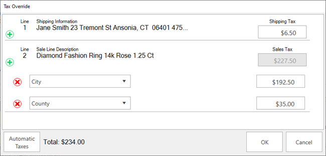 - The Tax Override window will appear. Each line from the sale will be displayed along with the sales tax being charged.