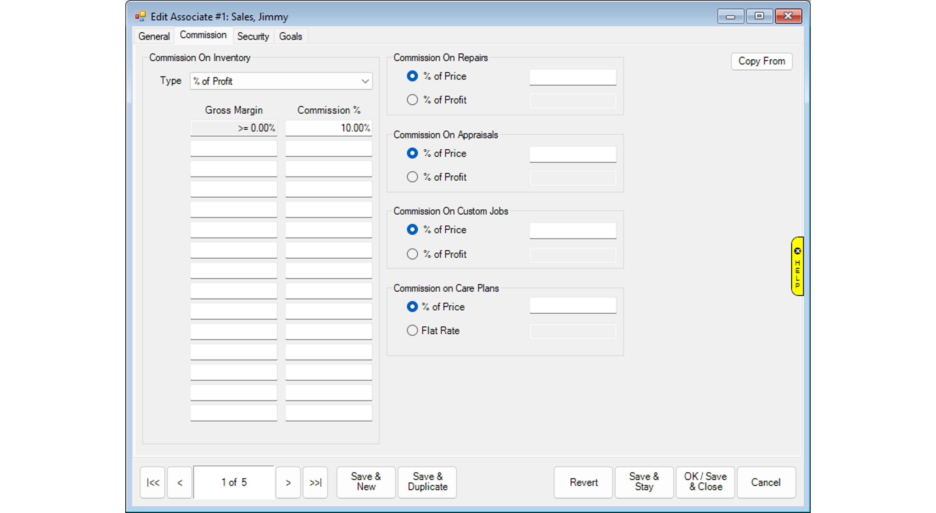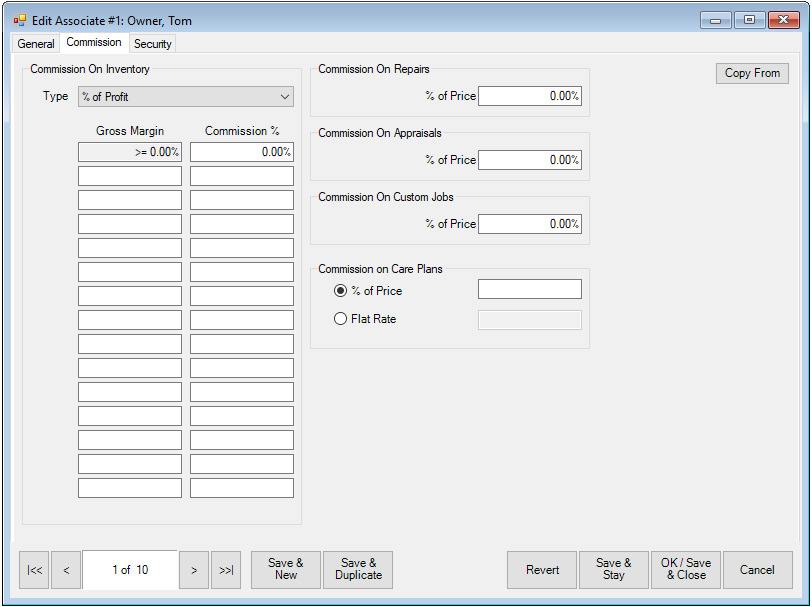 - Complete the fields in the Commission tab as appropriate or use Copy From to populate the fields from another associate.