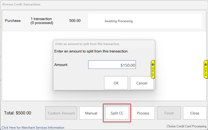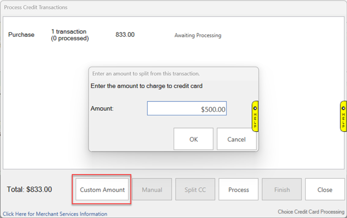 Customize the amount being charged to one credit card to split payment between multiple different tender options beyond just credit cards. For example, if a customer has both cash and credit card as payment and would like to pay $500.00 with the credit card and the remainder in cash, you can put $500 as the amount using the Custom Amount button: