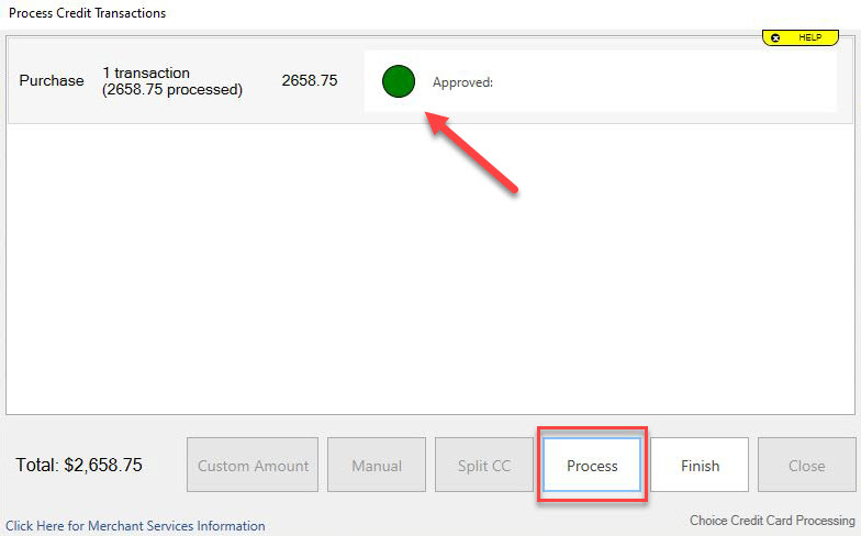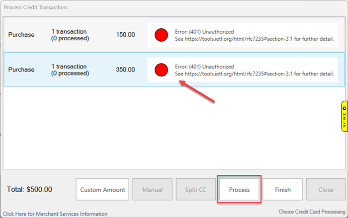 Process the credit card(s). Processing a credit card using Process requires a card to be swiped. You will see a green dot if the charge was completed successfully, or you will see a red dot with error message indicating that the process could not be completed.