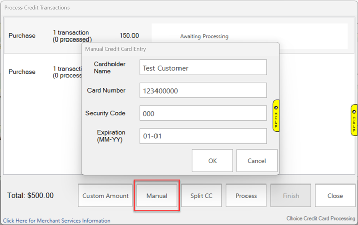 NOTE: The Finish button is only enabled if credit cards have been processed by using either the Process or Manual buttons. If a transaction line says Awaiting Processing. you can only close out of the screen using the Close button.