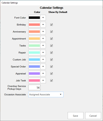 - Use the Show By Default checkbox to determine which occasions and services appear on the calendar by default. These can always be changed on the fly from the main calendar view, too.