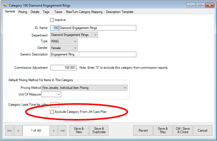 - Select Exclude Category from JM Care Plan. Only loose stone and component categories are excluded by default.