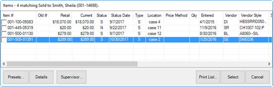 - From the Item # drop-down menu, select Bought. A list of items purchased by the customer will appear.