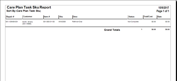The Care Plan Repair SKU report lists repair SKUs used for care plan-covered repairs during the specified time period.