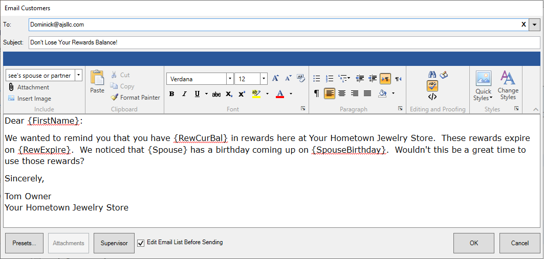 - Select OK to generate a list of matching customers. Select those you wish to email and select OK to send out the email.
