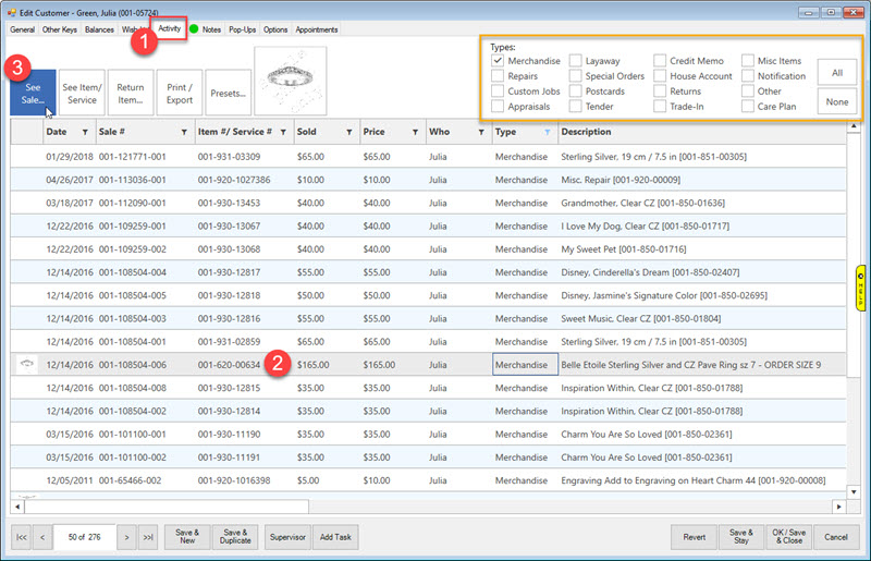 NOTE: It may be helpful to use the filter checkboxes. For example, choose Merchandise to see only sales with sold inventory items.