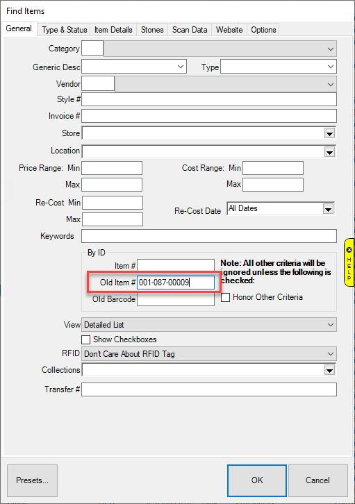 - To verify your bulk items by old stock number (or .OLD STOCK #), enter your item number in the Old Item # field on the General tab of the Find Items filter.