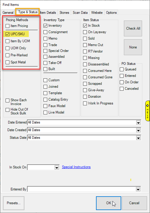 Selling bulk items in POS works exactly the same as selling fine jewelry items, as described in previous item verification articles. The only difference is specifying the Pricing Method ONLY as UPC/SKU on the Type & Status tab of the Find Items filter. Doing so will pull up a list of ONLY your UPC/SKU bulk items: