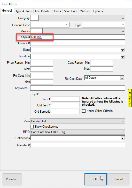 - You will see the Find Items window open on the General tab. To search by Vendor Style, enter your style number into the Style # box.