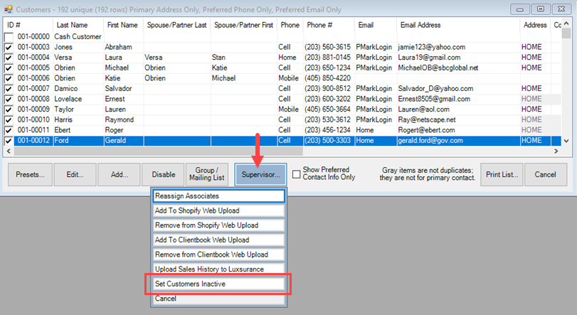 - For a single customer, you can click on them to highlight. For multiple, right click and Show Checkboxes, then check all the customers you wish to make inactive.