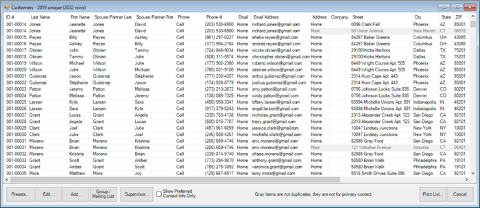 After performing a Customer Find you will be presented with a Customer List showing all the customers that matched your search criteria. The resulting list resembles a spreadsheet with customer data separated into columns. This list is both interactive and customizable.