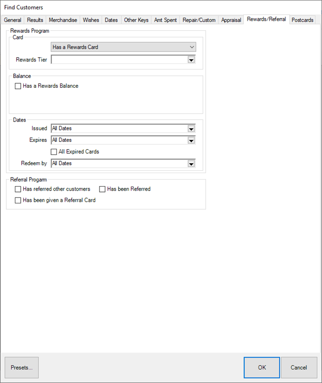 Include customers regardless of whether they have rewards card, or only include customers with rewards cards, or only include customers without; many of the other fields and options only display if this is set to 'Has a Rewards Card' |