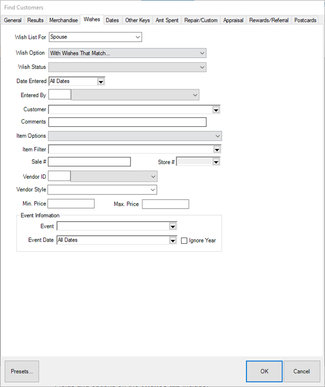 Include customers with wishes for events that fall within this date range; use the ignore year checkbox to only consider month and day |