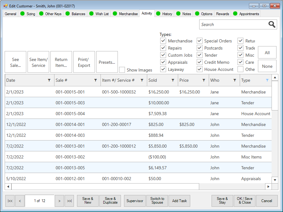 The Activity tab contains the full transaction history for the customer and their spouse/partner. From here you can view the transaction receipts as well as see associated items and jobs.