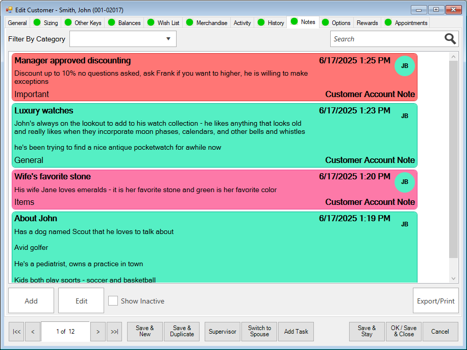 The Notes tab contains all notes for both the primary customer and their spouse/partner. There is an option on each note to set it to automatically pop-up at POS when the customer is selected.