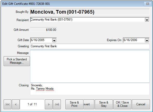 - Select a gift certificate from the Gift Certificate List and Edit it or double-click on the record. The Edit Gift Certificate window will appear.