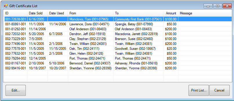 - The Gift Certificate List along with basic information about each will appear on the window.