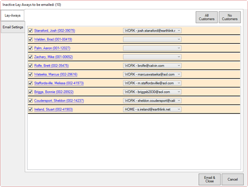 You may notice that customers are putting things on layaway and not following up. Using the Layaway Email feature, you can locate layaways that are inactive and remind customers about them.
