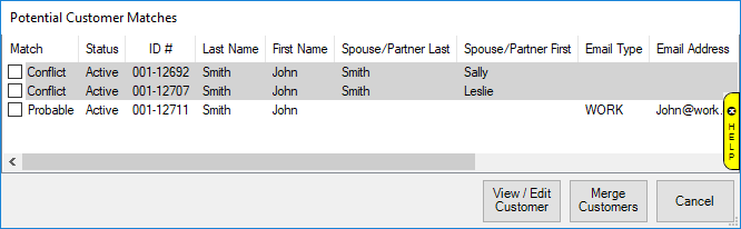Duplicate Check & Merge Use this to automatically search for duplicate customers.  Probable matches will be returned and you can merge multiple records at once.  In cases of conflicting information the data from the originally selected customer will be retained.  Any conflicts will be noted on the merged customer's notes.