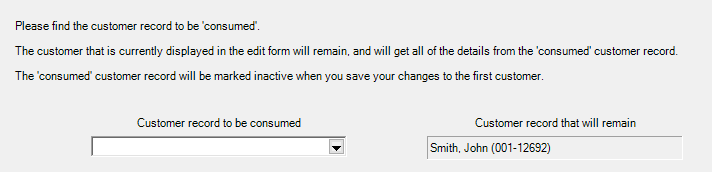 6. Unlike Merge, you will not be prompted to select data to take from consumed records.  In the case of conflicts, the data from the originally selected customer is retained.  Check the customer's notes after the merge for details.