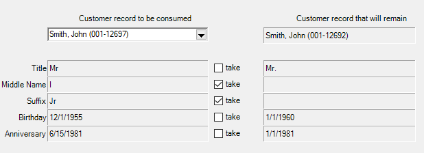 • If the originally selected customer DOES have a spouse, that information will be retained and you will not be able to choose a different spouse from a customer being consumed.  Any conflicting spouse data will be ignored while any missing data (e.g., spouse birthday) will be brought over.