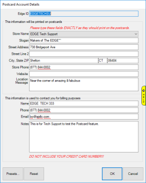 NOTE: Most fields will be pre-filled based on your Edge license. The top section is used for printing on the postcards while the bottom section is your billing contact information.