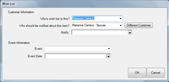 The default is the spouse of the person whose wish list you are entering. Click Different Customer to notify a different customer altogether.