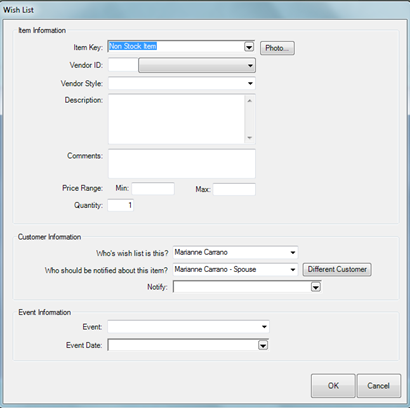 Wish List Entry Mode offers a view of the POS screen that allows for much more wish list flexibility. It does not require that the item be in stock. In fact, wish list items can be rough ideas or descriptions of items.