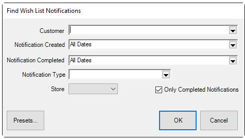 - Select Customer > Wish Lists > Notifications > Find. The Find Wish List Notifications filter will appear.