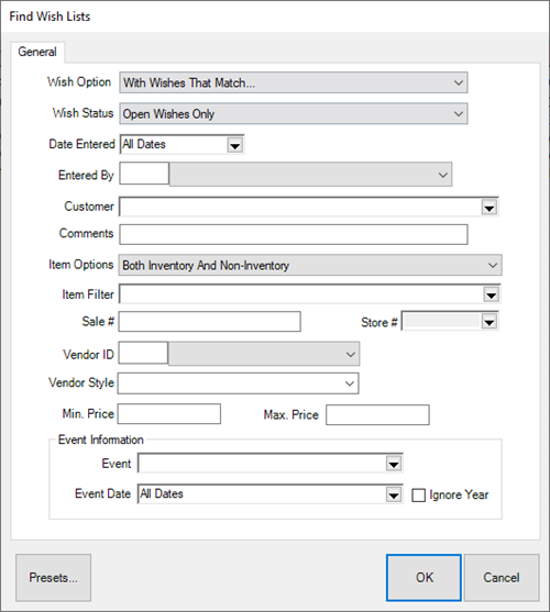 - Enter desired criteria and click OK. See Customer Find: Wishes Tab for definitions of the fields and options here.