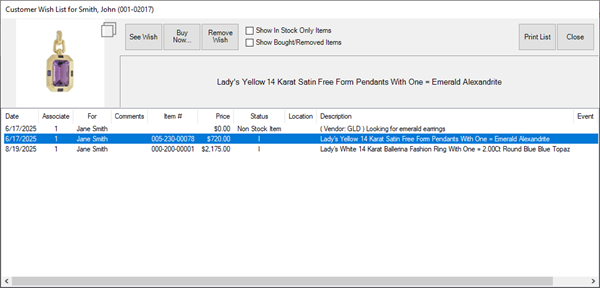 - Click Wish List > Show my Wish List Items. The Customer Wish List window will appear.