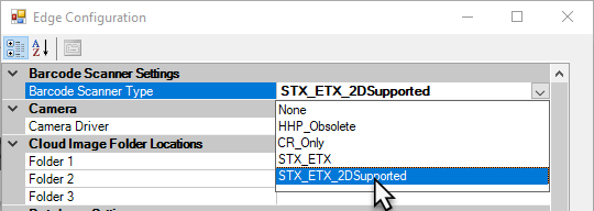 This configuration step must be completed prior to using the scanner in Edge as this scanner supports 2D barcode scanning. The Edge will come configured with the default scanner type of STX_ETX. For your scanner to work within Edge, you must manually change your scanner type to STX_ETX_2DSupported.