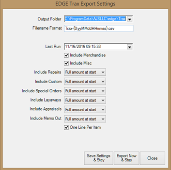 Fields and options in the Edge Trax Exports Settings window include: