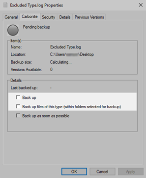 First, right-click on a file of that type (.bak) and select Carbonite; Properties. The Carbonite tab of the File Properties window will be displayed.