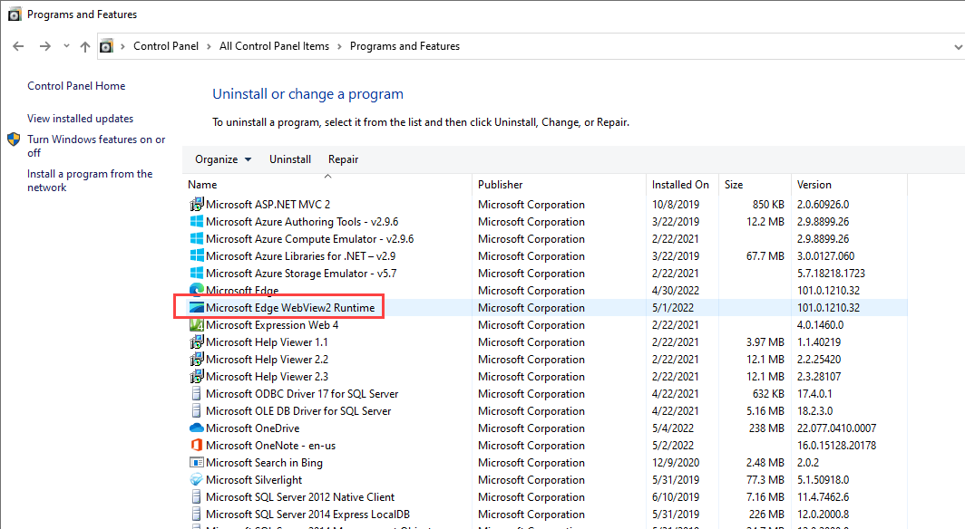 - If you do not see that file listed, then you must install the file manually. To install the file, follow this link: https://developer.microsoft.com/en-us/microsoft-edge/webview2/#download-section