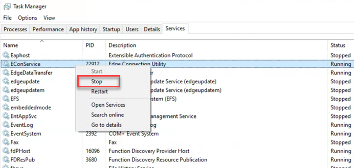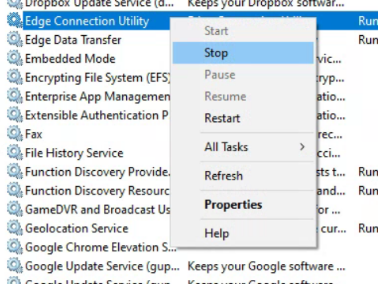 - Find Edge Connection Utility in the list, then right click on it and select Stop.