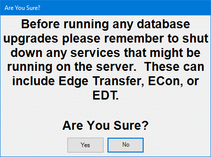 We highly recommend restarting your Server after the update has completed, BEFORE starting to use Edge. This will ensure all stopped services have restarted properly to resume syncing. If you choose not to reboot your Server computer, then the manually stopped services must be started again in the same manner as they were stopped once the database upgrade is complete in order to properly resume syncing.