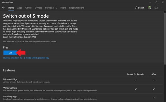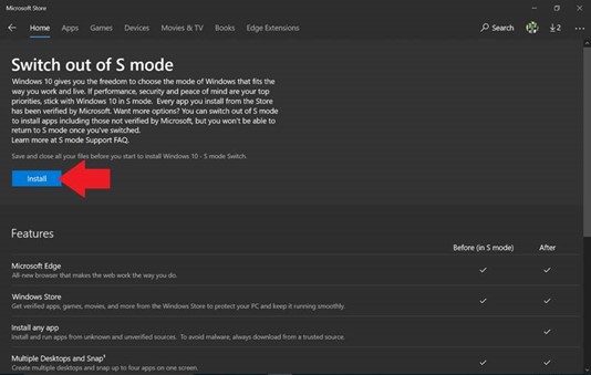 The process to switch out of S mode should take only a few seconds. You do not need to restart the PC for it to take effect. Once completed, you can install programs normally.