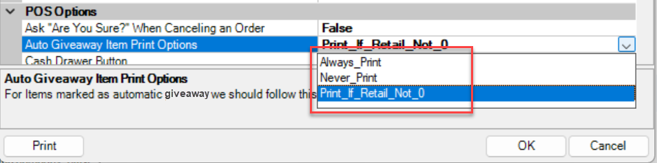 - Locate the option named Auto Giveaway Item Print Options and click the dropdown arrow to select a printing rule.