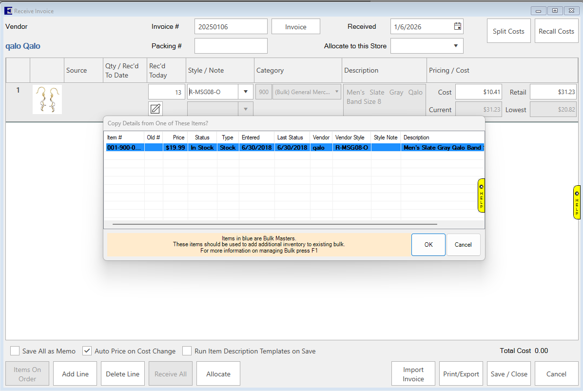 - Click the Bulk Master (highlighted blue) and click OK. The Cost and Retail will prefill. You can update these if necessary.