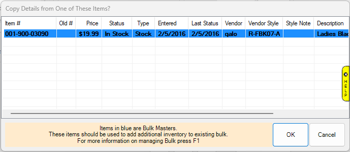 The system will automatically take you to this screen if you try to add this as a new item and it finds a bulk master with a matching vendor and style. The Copy From window will appear with the bulk master highlighted in blue; double click on it.